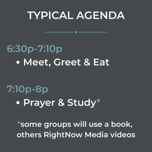 Each Together Group will set its own agenda. We want our groups to meet peoples needs, not just promote the churches idea of best schedule.